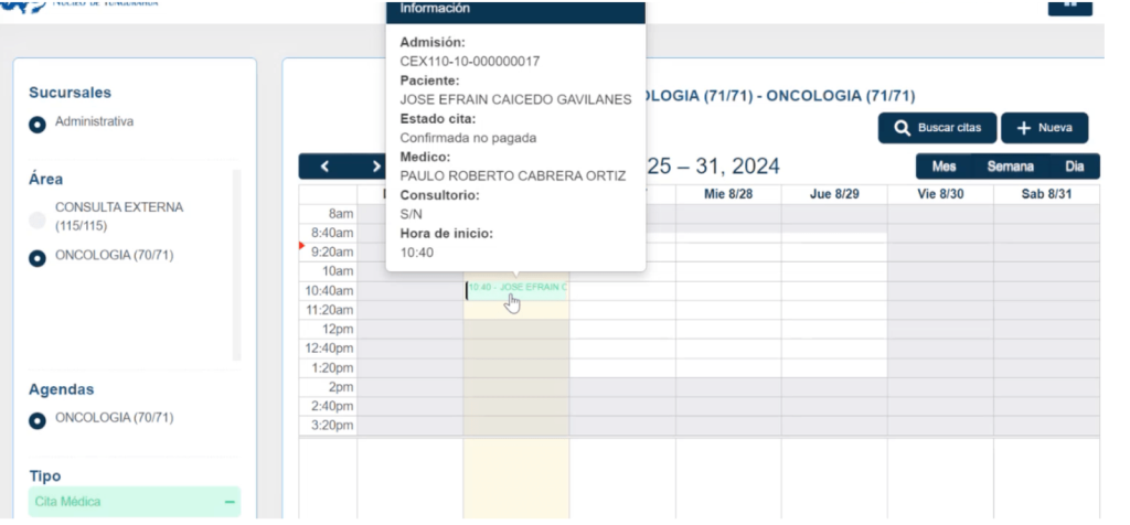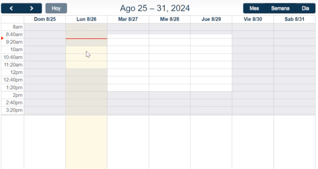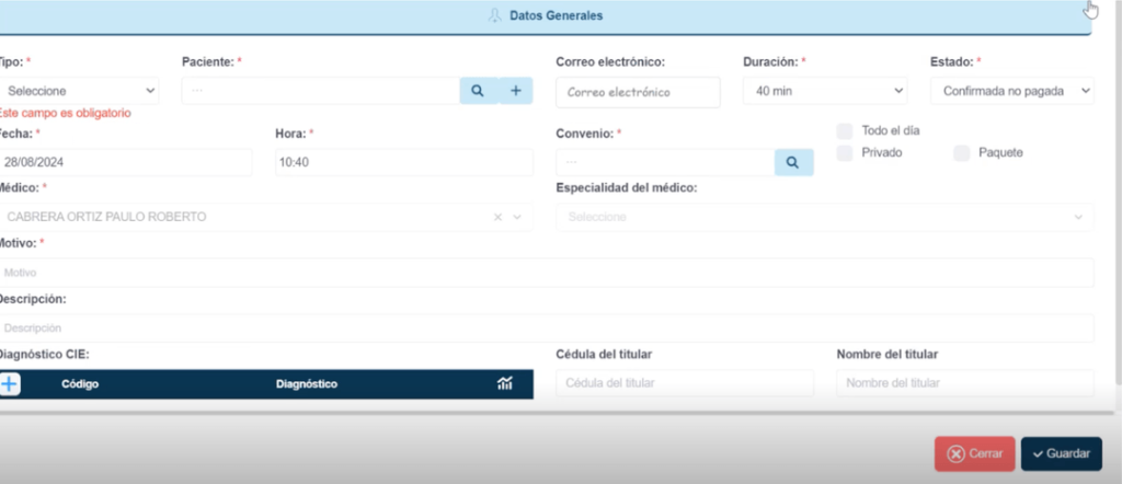 Para poder agendar, dar doble click, al espacio donde se quiere agendar la cita. Se abre un pop up de creación de nueva cita.