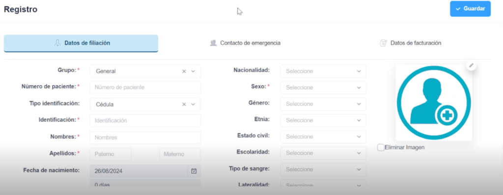 Lo primero que se debe completar es el tipo de identificación y el paciente, en este caso, se puede buscar uno existente o si es un paciente nuevo se puede generar apretando el sigo “+” al lado del campo de paciente.