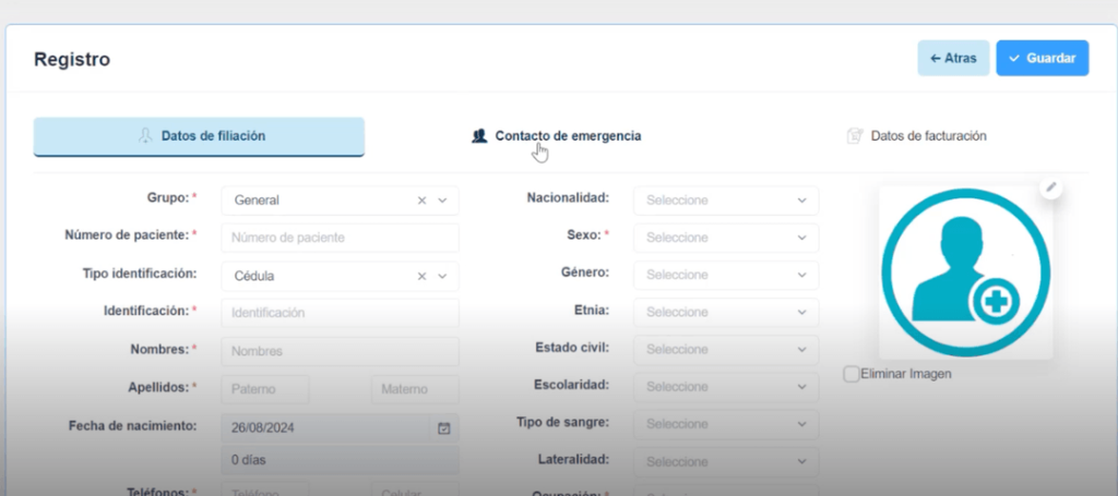 Al crear un nuevo paciente vamos a tener que completar 3 pestañas: Datos de filiación, contacto de emergencia y datos de facturación