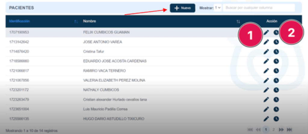 El botón de “+ Nuevo” en la derecha superior de la tabla se usa para crear un nuevo paciente.