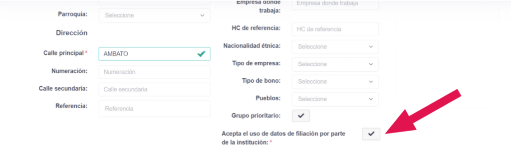 Para poder crear al paciente recuerda siempre aceptar el uso de datos de filiacion por parte de la institución.