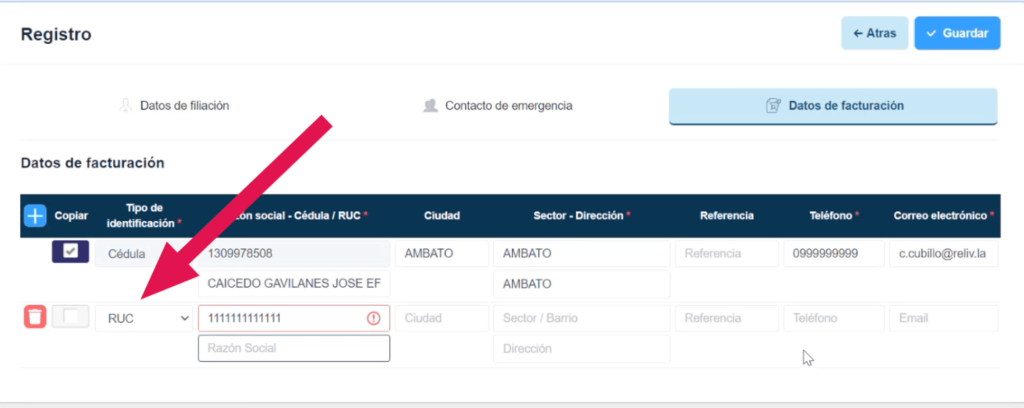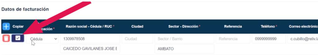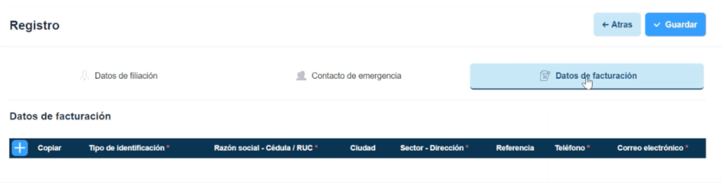 Dar clic al botón más dentro de la tabla en la izquierda, y si el paciente es a quien hay que facturar se debe dar check a la columna “copiar”. De esta manera, me trae todos los datos de filiación del paciente generados anteriormente.