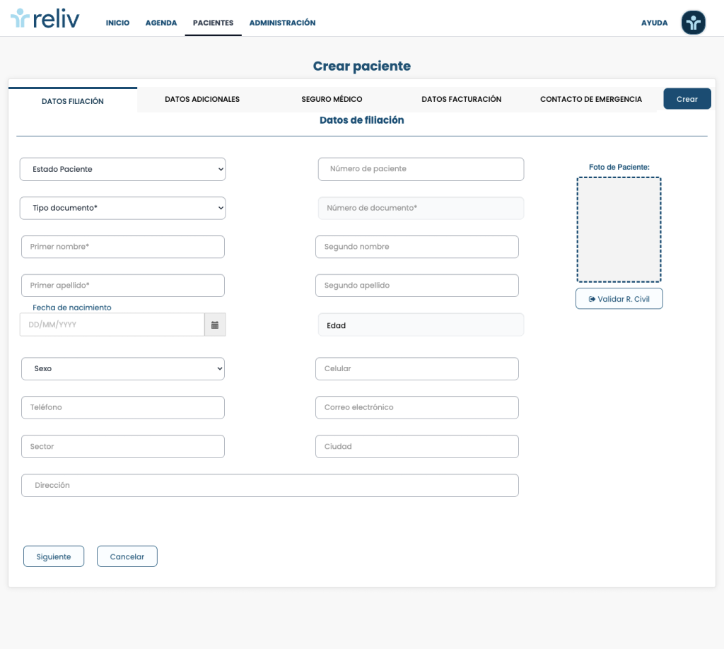 Botón + Nuevo paciente: Al hacer click aquí, se abriran datos de filiación del paciente que deberás completar. Al hacer click aquí, podrá crear un Nuevo Paciente, se abrirá la siguiente pantalla.