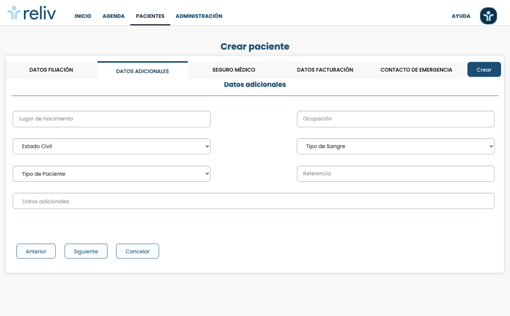 Asegurate de haber completado todos los campos de datos adicionales, ya que existe informacion obligatoria que si no los completas, no podrás crear un nuevo paciente. Una vez hecho esto da click al botón Siguiente.