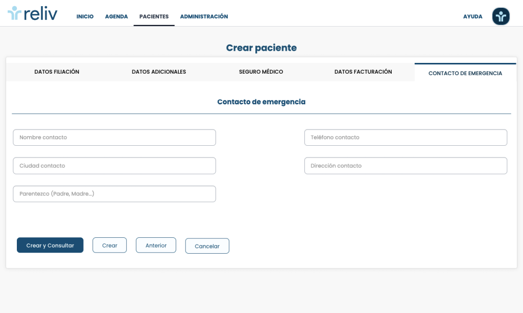 5. Contacto de emergencia: En este paso puedes registrar los datos del contacto de emergencia del paciente.