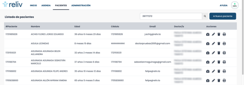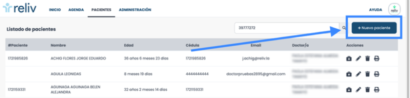 En este módulo encontrará un listado de todos sus pacientes registrados. Desde aquí puede buscar, crear, editar, eliminar, ver e imprimir los datos y consultar las historias clínicas de sus pacientes. Además, puede exportar en un Excel todo el listado de sus pacientes.