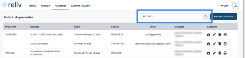 Buscador: A la derecha superior tendrá un buscador que podrá buscar por los siguientes parámetros: número de paciente, nombres, apellidos o número de identificación.